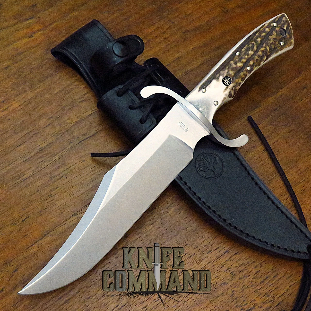The Boker Bowie measures 12-3/4″ overall and has a 7-3/4″ blade. This is a full tang knife with a 6.4 mm (1/4″) thick, N690 stainless steel blade that weighs in at 19 ounces. The blade has about 7-1/4″ of fine cutting edge and a large, sweeping bowie clip un-sharpened top edge. The handle scales are gorgeous Genuine Stag with a single finger groove design. They are held on with 6 pins and feature a lanyard hole and a Boker shield inlaid on one side. A large S-curved stainless steel double guard sets off this western style bowie. A high quality black leather sheath with leg ties is included.