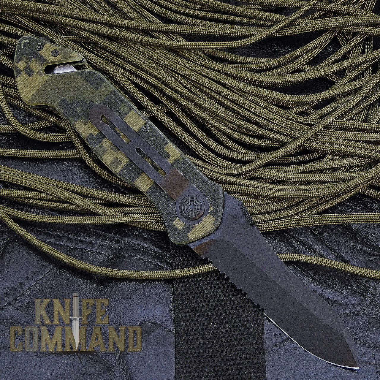 This knife features a Black Kal-Gard coated, 3.3″, half serrated, 2.5mm thick, Spear point blade made from stainless Böhler N695 steel (HRC 58). It is 8.1″ open length, 4.8″ closed. It has a super tough, ergonomically designed, textured handle of Digicam patterned G10. At the butt end, there is a hardened carbide glass breaker mounted just behind an integrated belt cutter with replaceable blade. There are black stainless steel liners with a liner lock mechanism. The lock is disengaged by a large black button on one side. The blade also has a large thumb disc for easy opening, even when wearing gloves. For carrying, there is a black stainless steel pocket clip.