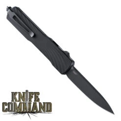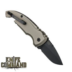 This knife features a Black Kal-Gard coated, 3.3″, half serrated, 2.5mm thick, Spear point blade made from stainless Böhler N695 steel (HRC 58). It is 8.1″ open length, 4.8″ closed. It has a super tough, ergonomically designed, textured handle of Black G10. At the butt end, there is a hardened carbide glass breaker mounted just behind an integrated, lever-action disposable restraint (handcuff) cutter. There are black stainless steel liners with a liner lock mechanism. The lock is disengaged by a large black button on one side. The blade also has a large thumb disc for easy opening, even when wearing gloves. For carrying, there is a black stainless steel pocket clip.