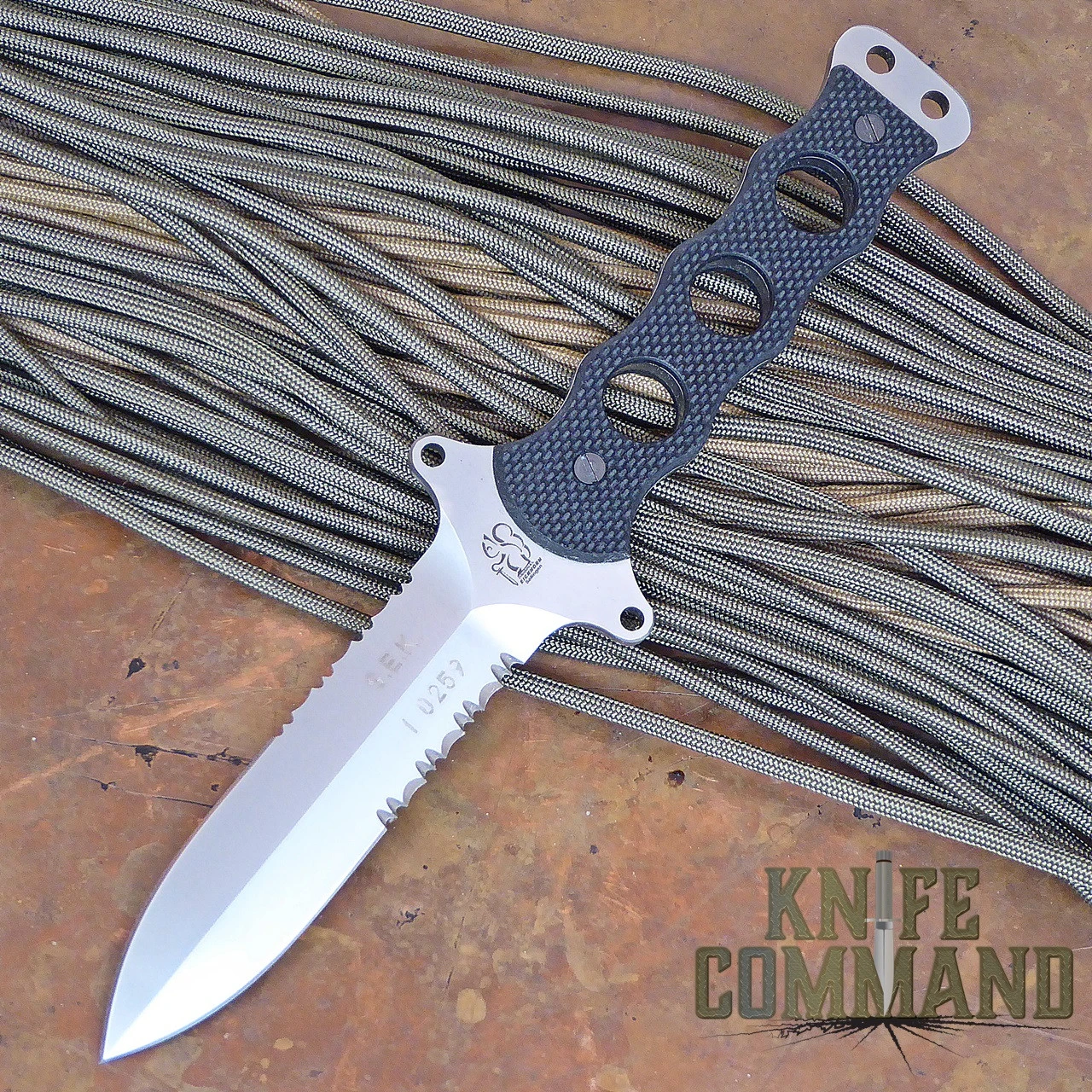 The SEK-P is 8-1/2″ overall with a 4″ double edged, dagger ground blade of corundum blasted, 5mm thick, Böhler N695 stainless steel, HRC 58. Both blade edges feature a fine edge point followed by 1-3/8″ of serrations and an integral double guard with lashing holes. The skeletonized handle carries black textured G10 scales with an exposed end with two lanyard holes. Each knife is individually serial numbered.