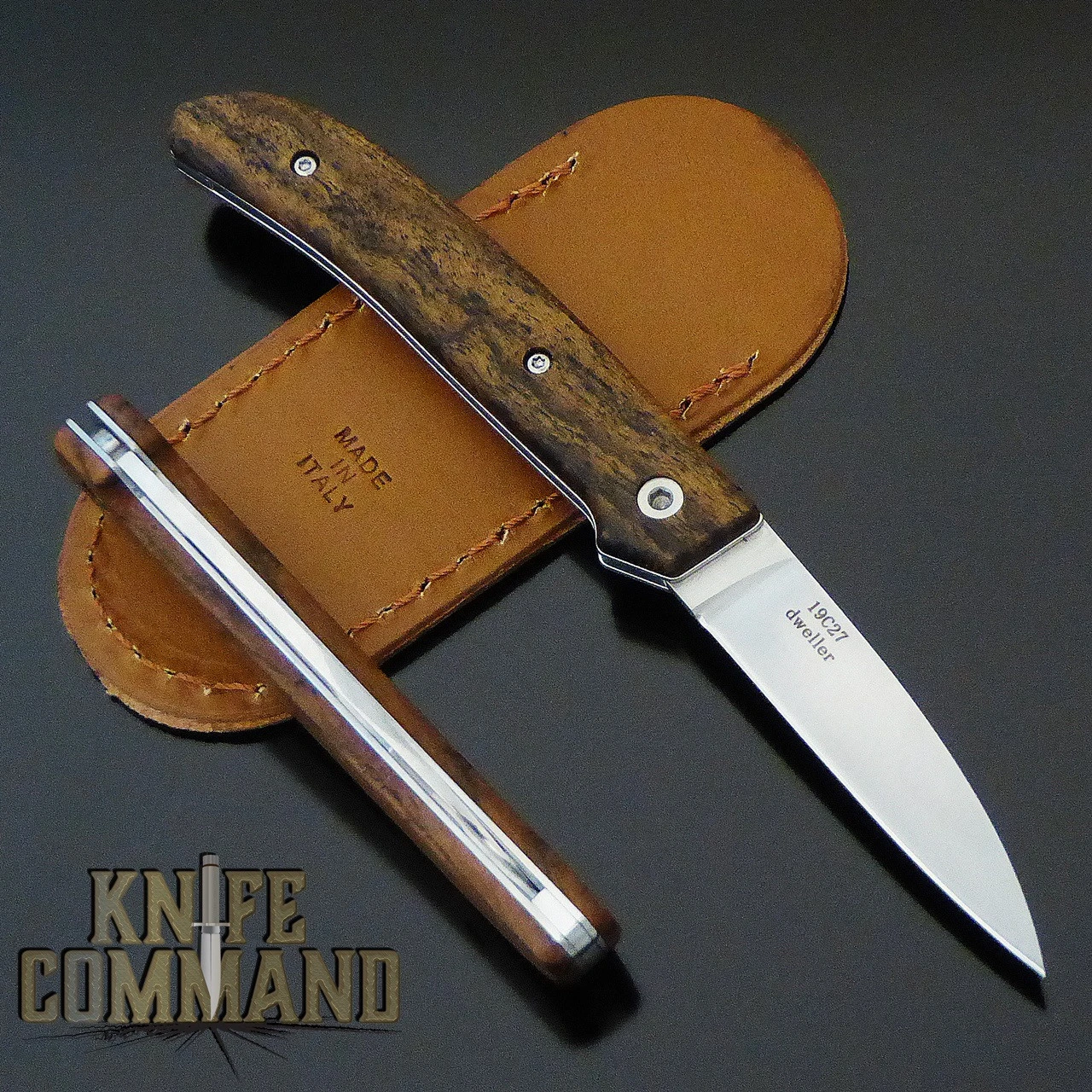 The Fantoni Dweller pocket knife is the perfect knife for daily use. It is the Fantoni version of the popular R.W Loveless designed, Lone Wolf City Knife. The Dweller features exotic wood handles, leather pouch, box, and is U.K. carry compliant.