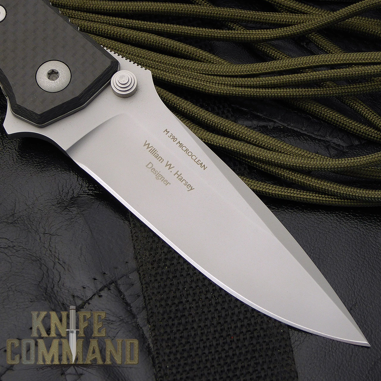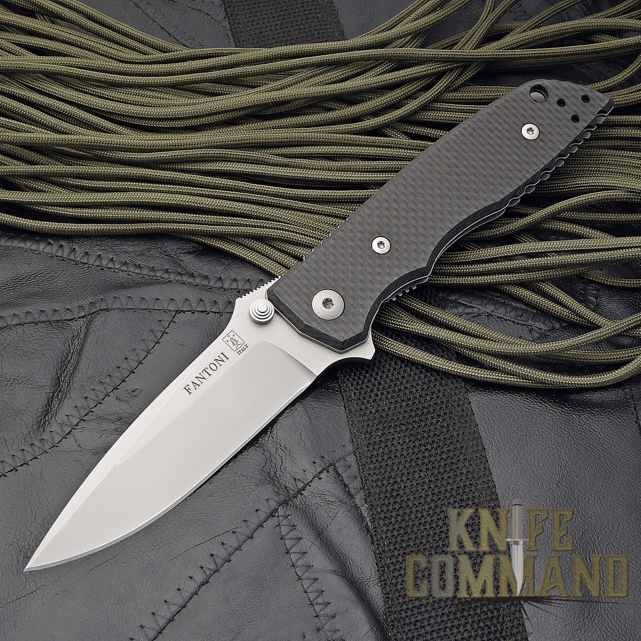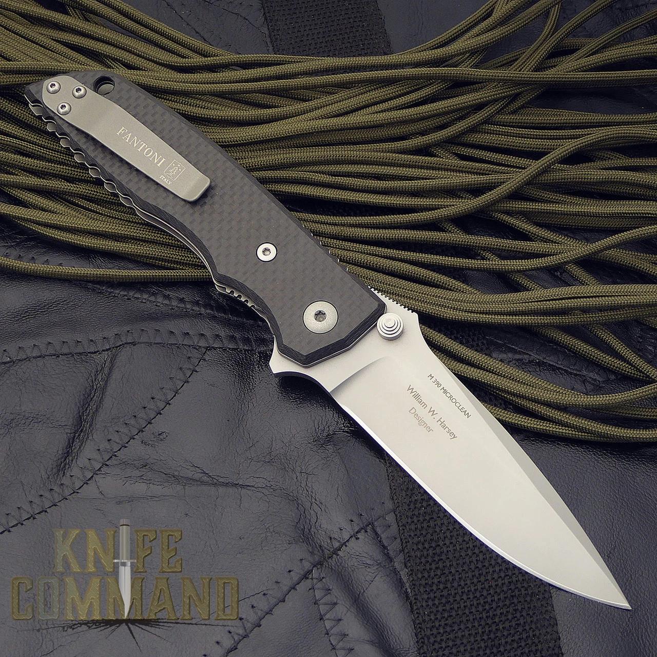 The HB 01 is the largest of the Fantoni made Harsey series of folders. The 4-1/4″ spearpoint blade mates perfectly with the black Carbon Fiber handle to make an impressive 9-1/2″ overall knife. The blade is of a satin like, bead blast finished Bohler M390 Microclean stainless steel hardened to a Rockwell 61-62. It has dual thumbstuds and a flipper tang to assist in rapid deployment. The handle is made of finely textured Carbon Fiber scales over 6AI4V titanium liners. The titanium pocket clip is reversible for either right or left hand, tip-up carry. The HB 01 has an open column design for easy cleaning and has a ribbed thumb ramp and jimping on the handle back, butt and underneath for a secure grip.