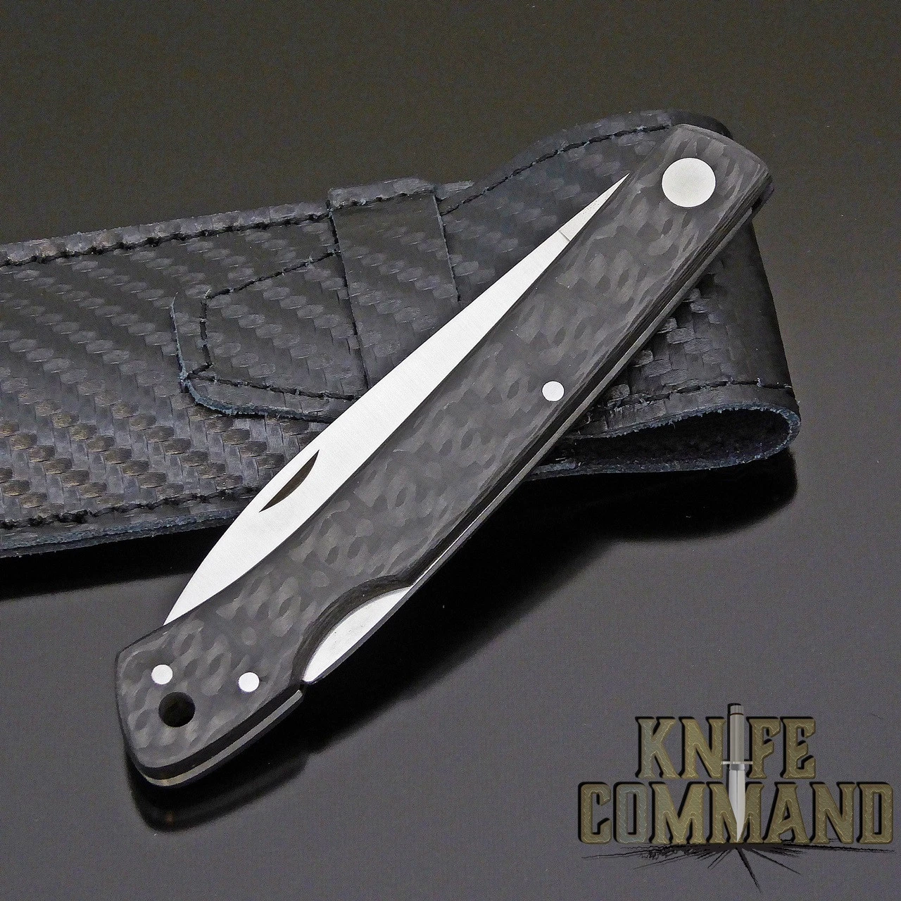 The 573CF is great for EDC. It measures 6-3/4″ open length, 3-5/8″ closed length, and weighs only .95 oz. The .08″ thick, drop-point blade is 2-3/4″ long and is hollow ground 440C stainless steel with a 55-57 Rockwell hardness. A traditional nail nick is used for easy opening and the black Carbon Fiber handle has a rear end lock back design to keep the blade securely open. A black carbon fiber styled leather pocket pouch is included. This 573CF is brand new in original Fox box.