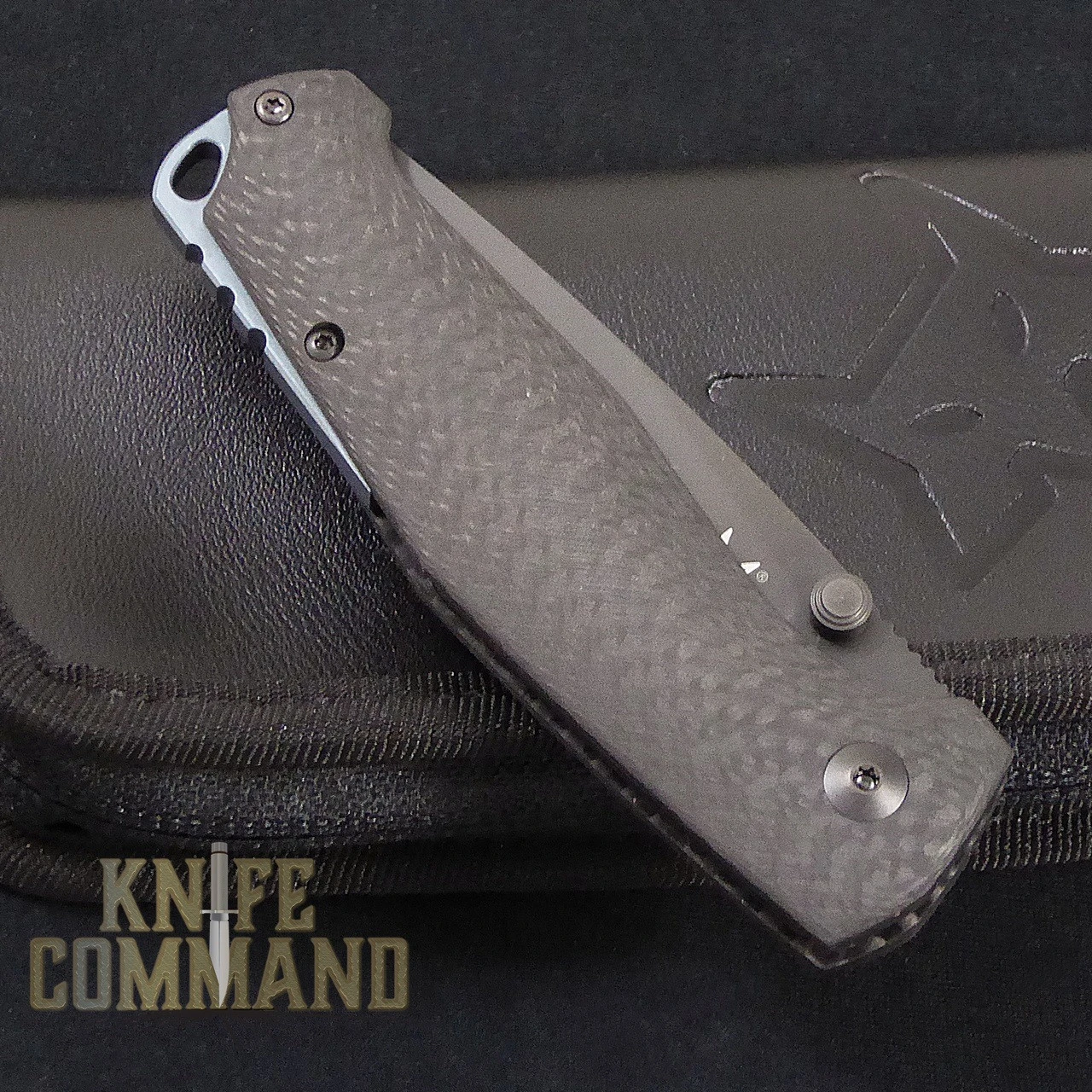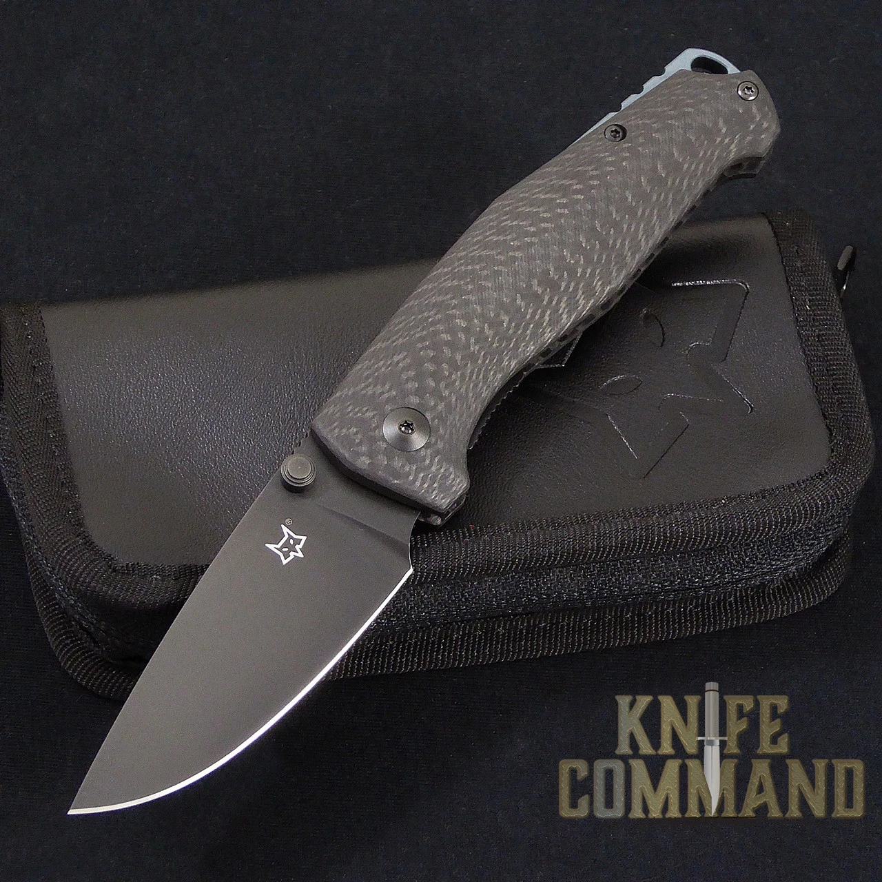 This knife is especially suited for every day carry. It measures 7 open length, 4″ closed length, and weighs only 3.3 oz. The 3.5mm thick, Black PVD Coated,drop-point blade is 2.95″ long and is forged from Elmax stainless steel with a 59-61 Rockwell hardness. Twin thumbstuds allow for easy one-hand opening. The handle is Carbon Fiber with a stainless steel liner lock design. The Tur features an exposed spacer lanyard hole and a Titanium pocket clip. Comes complete, brand new in original Fox box with a Fox zippered black leather pouch.