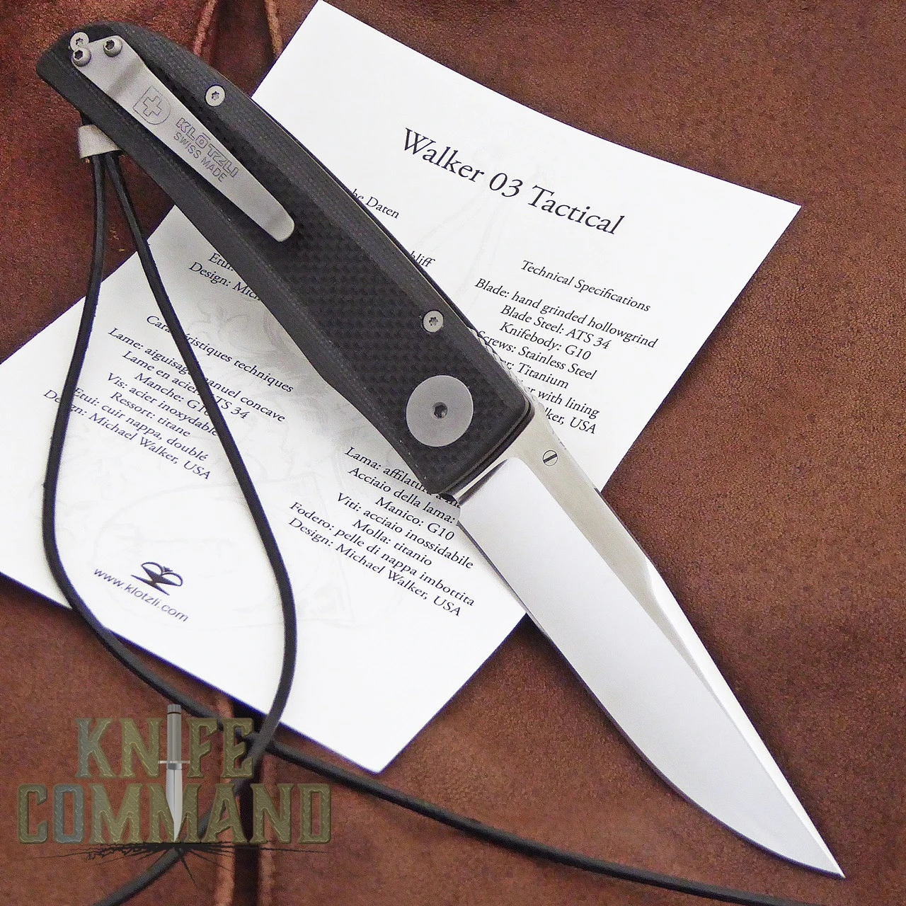 The Walker 03 Tactical features milled Black G-10 scales and a Titanium Walker liner lock. The 3-1/2″ clip point ATS-34 stainless steel blade has a fine cutting edge. There is a thumb stud for one hand opening. The G-10 handle is 4-1/2″ long and has an open back column design with a classic split-tail leather lanyard. The milled G-10 scales have a coarse texture strip down the middle for a very sure grip. A stainless steel Klotzli pocket clip keeps your knife at the ready. Weighing only 2.5 ounces, this 8″ open length folder is almost weightless cutting power. The Walker 03 Tactical comes brand new in the original Klotzli box with all papers and a black leather pocket pouch.