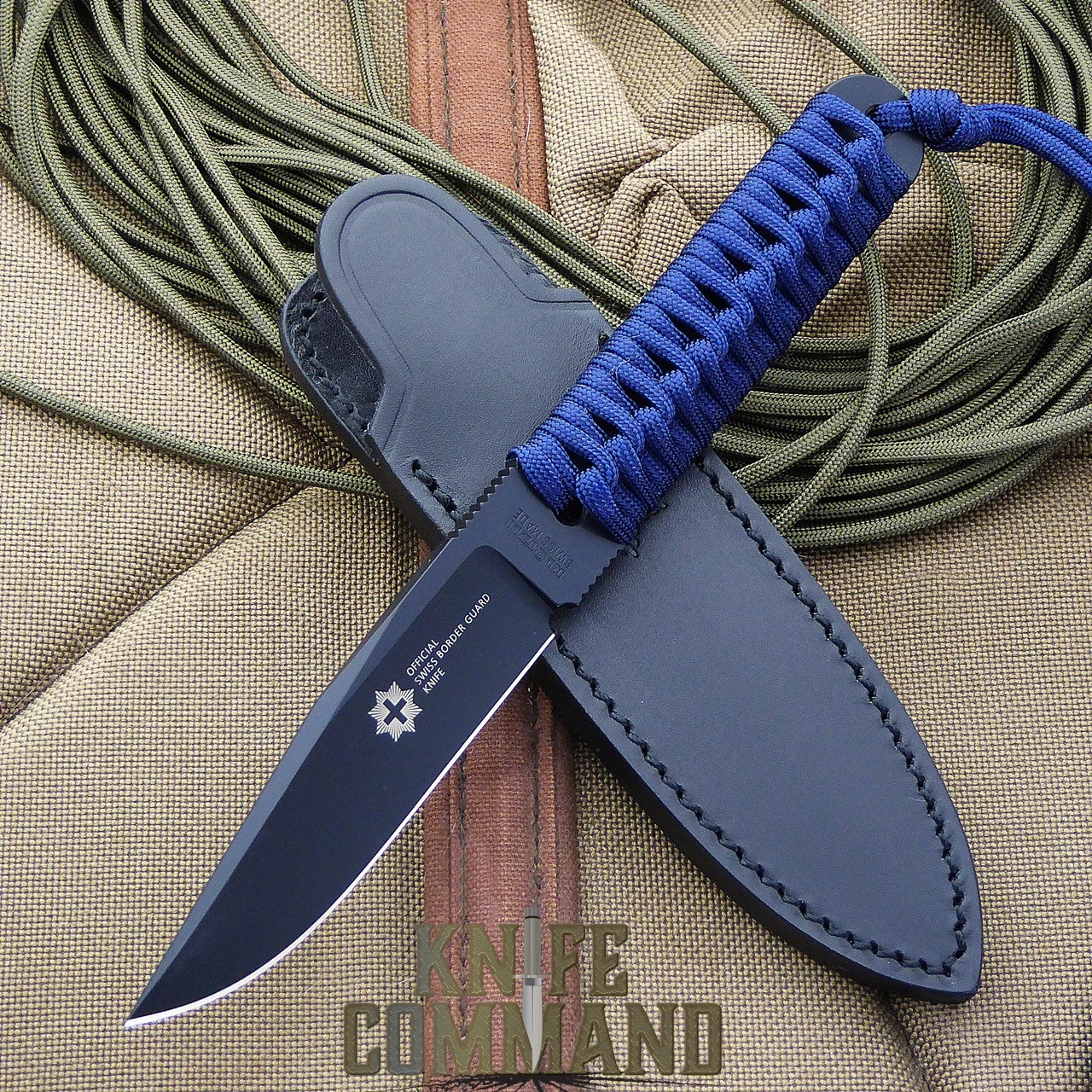 This one-piece knife is 8-1/4″ long with a 3-3/4″ blade. It is hollow ground by hand out of Bohler N690 stainless steel and hardened to HRC 56-57. The knife is 5.09mm thick and weighs 4.4 ounces. There are ribs on top and bottom for a safe grip. The knife is coated in black teflon and is pre-wrapped in dark blue paracord. The Swiss Border Guard logo is on one side of the blade. For carrying, a very high quality black leather sheath is provided. The sheath has the Swiss Border Guard logo embossed on the front and has a black metal clip on the back. It can be conveniently carried as a boot knife, or on a belt or pack.