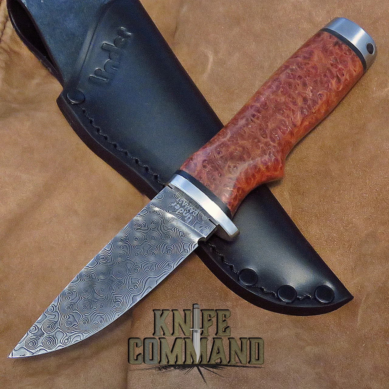The Damascus Amboina Hunter is a handmade beauty. Heirloom quality. Another fine Linder knife made in Solingen, Germany. Knife Command is an authorized Linder Solingen dealer.