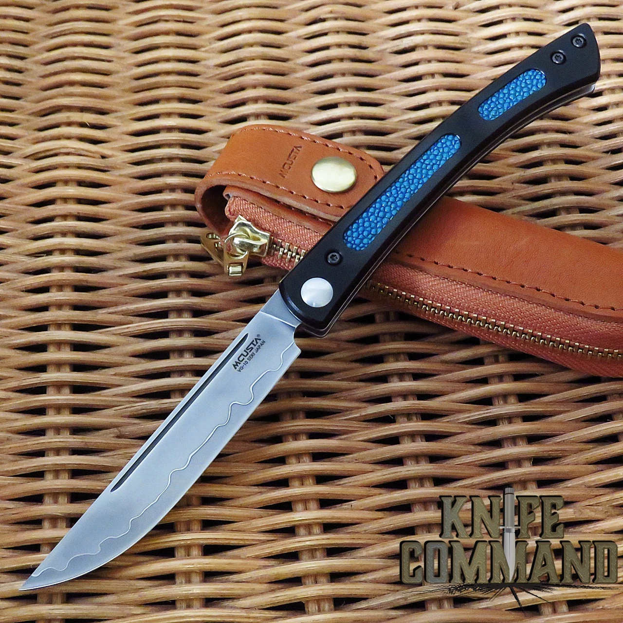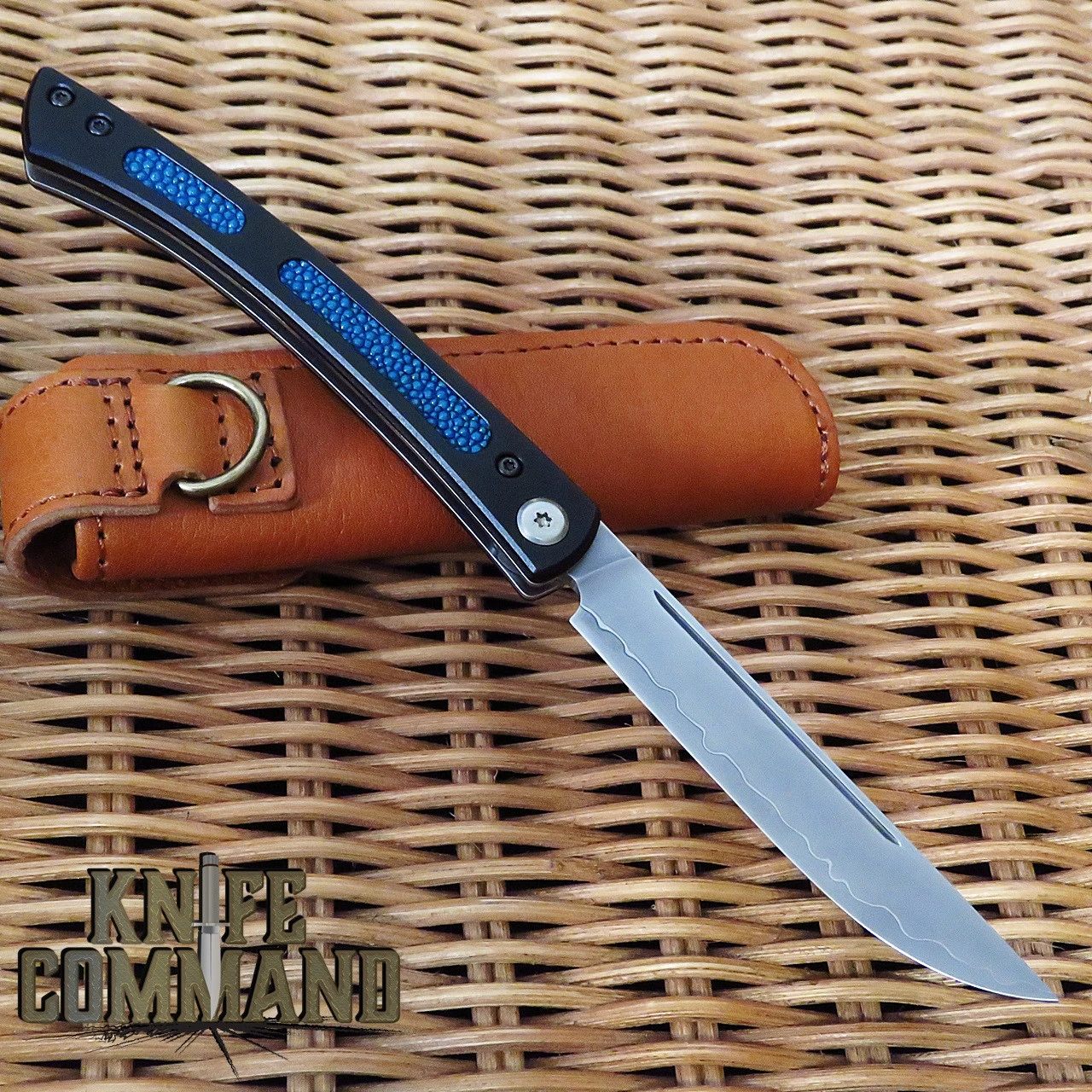 The Executive folding steak knife is a personal knife with beauty and elegance of Japanese design. Made in Seki, Japan, Mcusta combines modern technology with traditional Japanese craftsmanship to produce hand finished custom quality production knives. This limited edition knife measures 4.56″ long closed and features a 3.625″, 3-layer, VG-10 Core blade, HRC 60-61. The handle has a 420J2 frame with Black anodized aluminum handle scales and has custom blue stingray inlays on both sides. The blade features slipJoint action with strong detent at closed, half-way, and full open. Comes with special leather sheath with snap closure at top and zipper on side.
