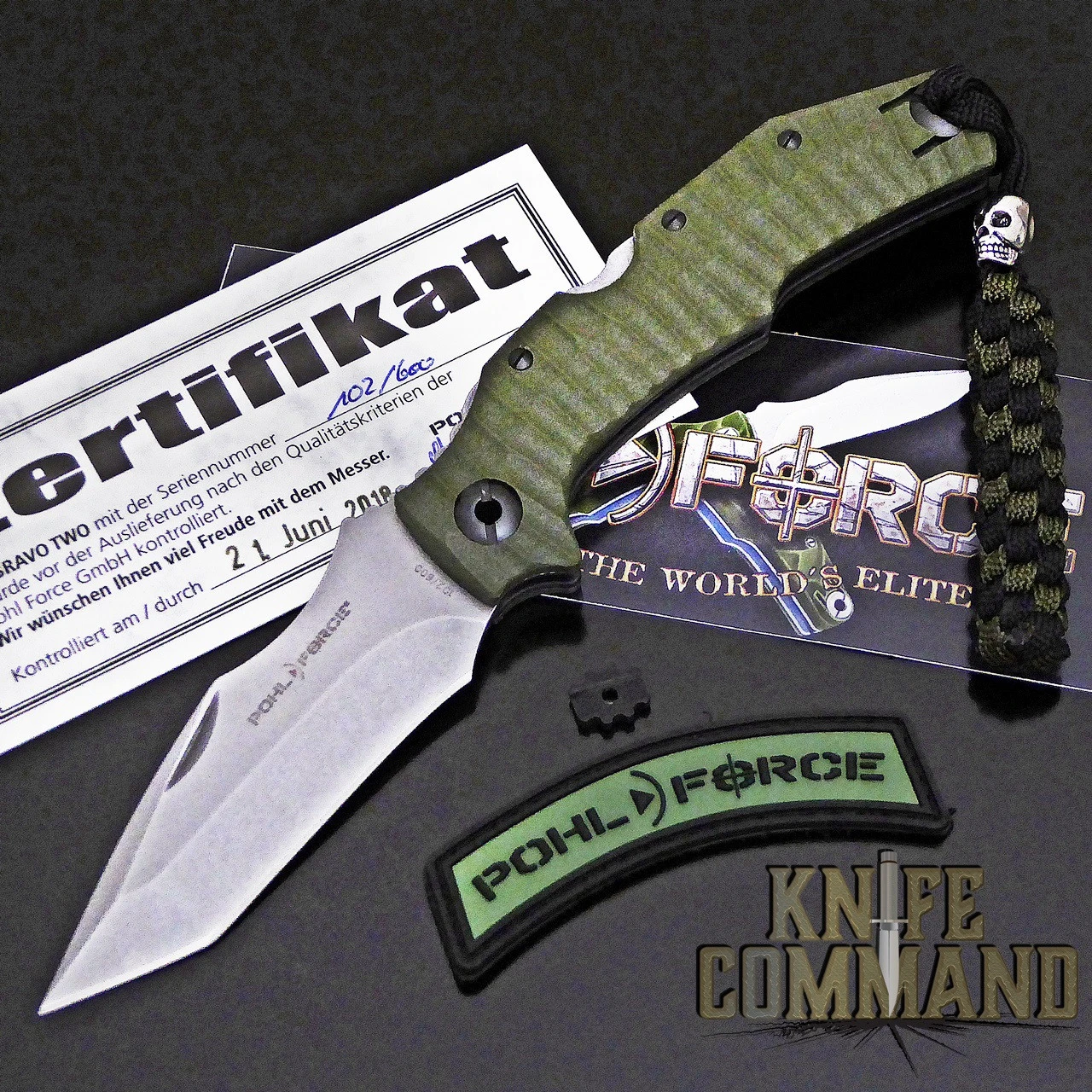 This Bravo Two measures 7-3/4″ open length, 4-1/4″ closed length, and weighs only 4.25 oz. The 3.5mm thick, stonewash finished blade is 3-1/4″ long and is forged from CTS-BD1 stainless steel. This Tanto point blade can be opened with two hands, or, install the included thumb disc for easy one-hand opening. The handle features a solid, lock back design. It has 4mm thick OD Green Zytel® scales on top of 1.5mm thick black steel liners. For convenience, all fasteners can be removed with a flat blade screwdriver. The pocket clip is reversible for right or left hand carry and it comes with a braided paracord lanyard with skull bead. The Bravo Two Tactical is brand new in box, complete with a Certificate of Authenticity, Pohl Force sticker and rubber patch.