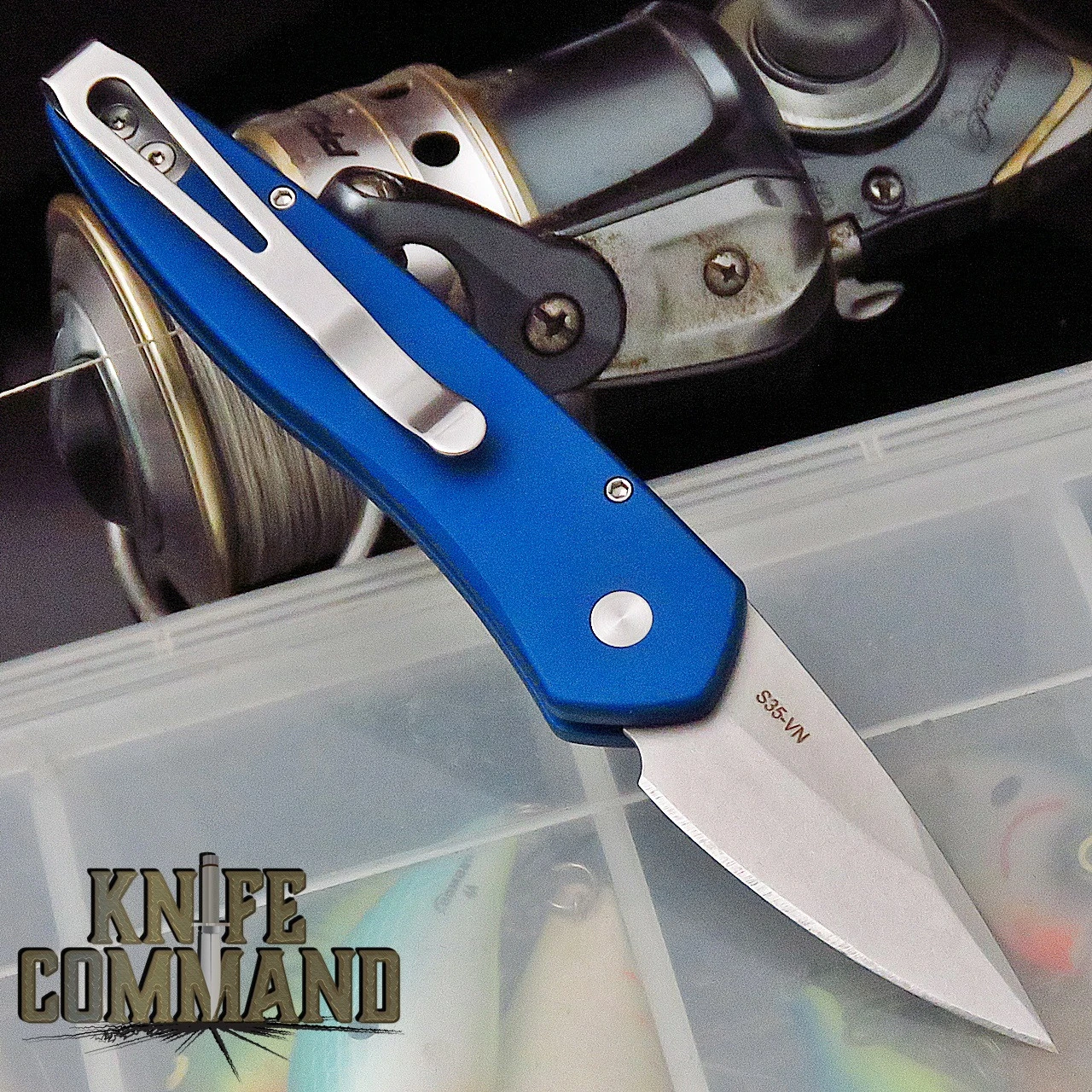 This Half-Breed model 3605-Blue is 6-1/8″ in overall length with a 2″ spear point blade of Stonewash finished CPM S35-VN stainless steel. It has a 4-1/8″ handle made of 6061-T6 Blue aluminum with satin finished hardware and push button. The knife thickness is .39″ and weighs 2 ounces. This is a right-hand, tip-up, recessed push button automatic folder with a satin pocket clip.