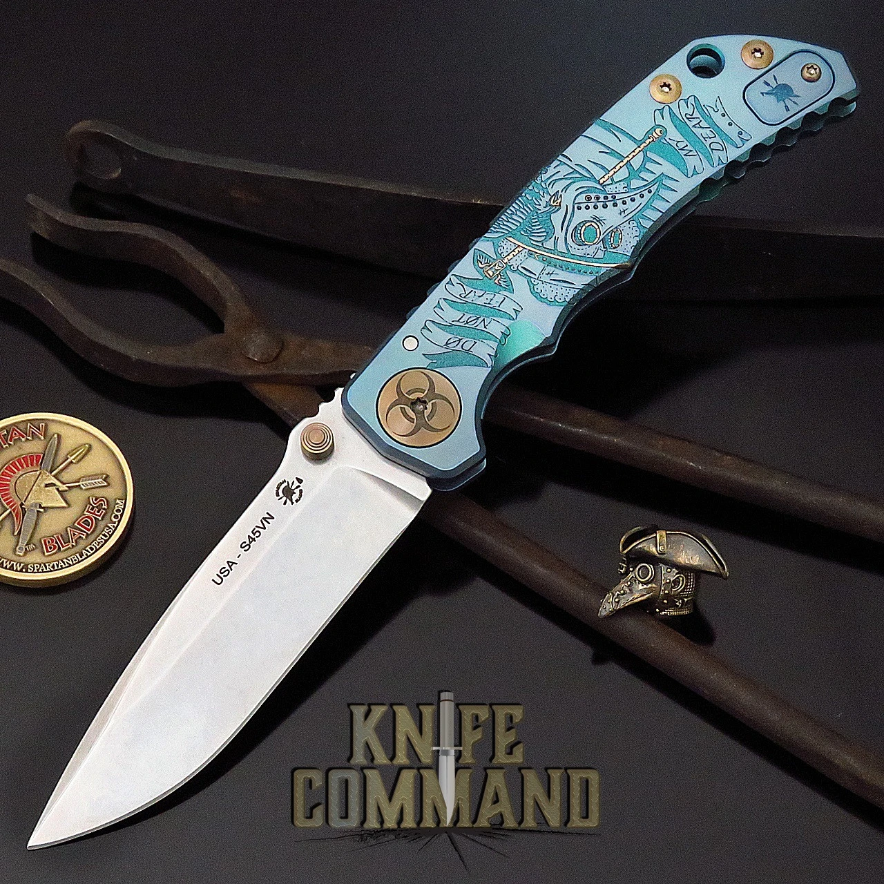 This variation of the Spartan Harsey Folding Knife features Blue Green titanium handle scales. This is Special Edition knife has a masked Plague Doctor “Do not fear, My Dear” on one side, Corona style viruses on the other. The Stonewash S45VN blade and bronze hardware make this one stunning piece.