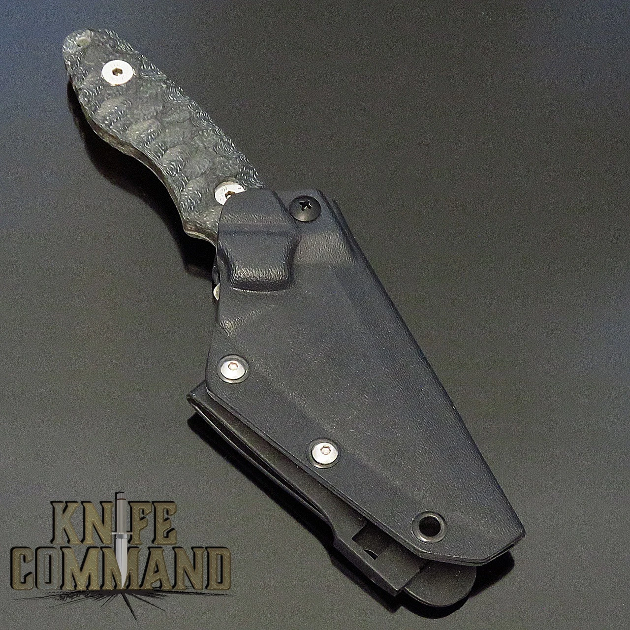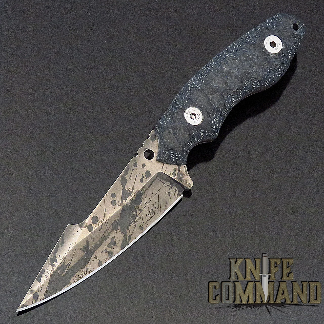 This Wander Tactical Custom Barracuda 8-1/8″ in overall length and weighs 6.7oz. The 3.9” full tang, blade is forged of D2 steel with a Custom Black Blood GunKote finish. The blade has a complex grind with a fine cutting edge behind a spear-type piercing point. The upper false edge can be sharpened for a super aggressive blade. The Custom Black Canvas Micarta handles are held in place on the 3/16″ thich steel with A2-70 stainless steel bolts. It features two sets of jimping on the handle top and one underneath.